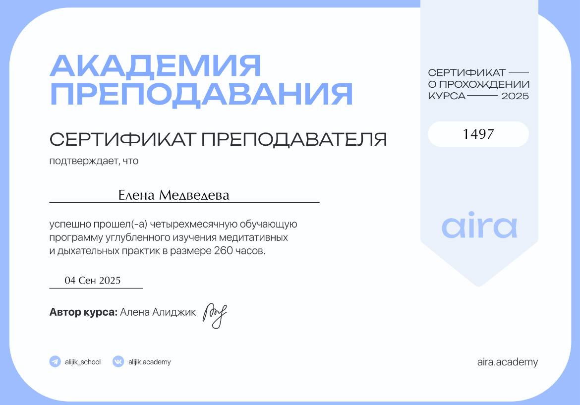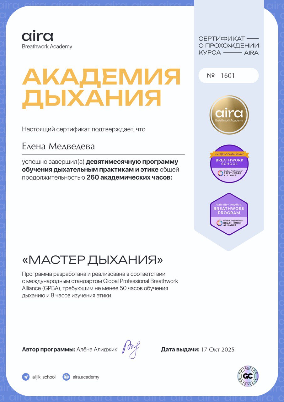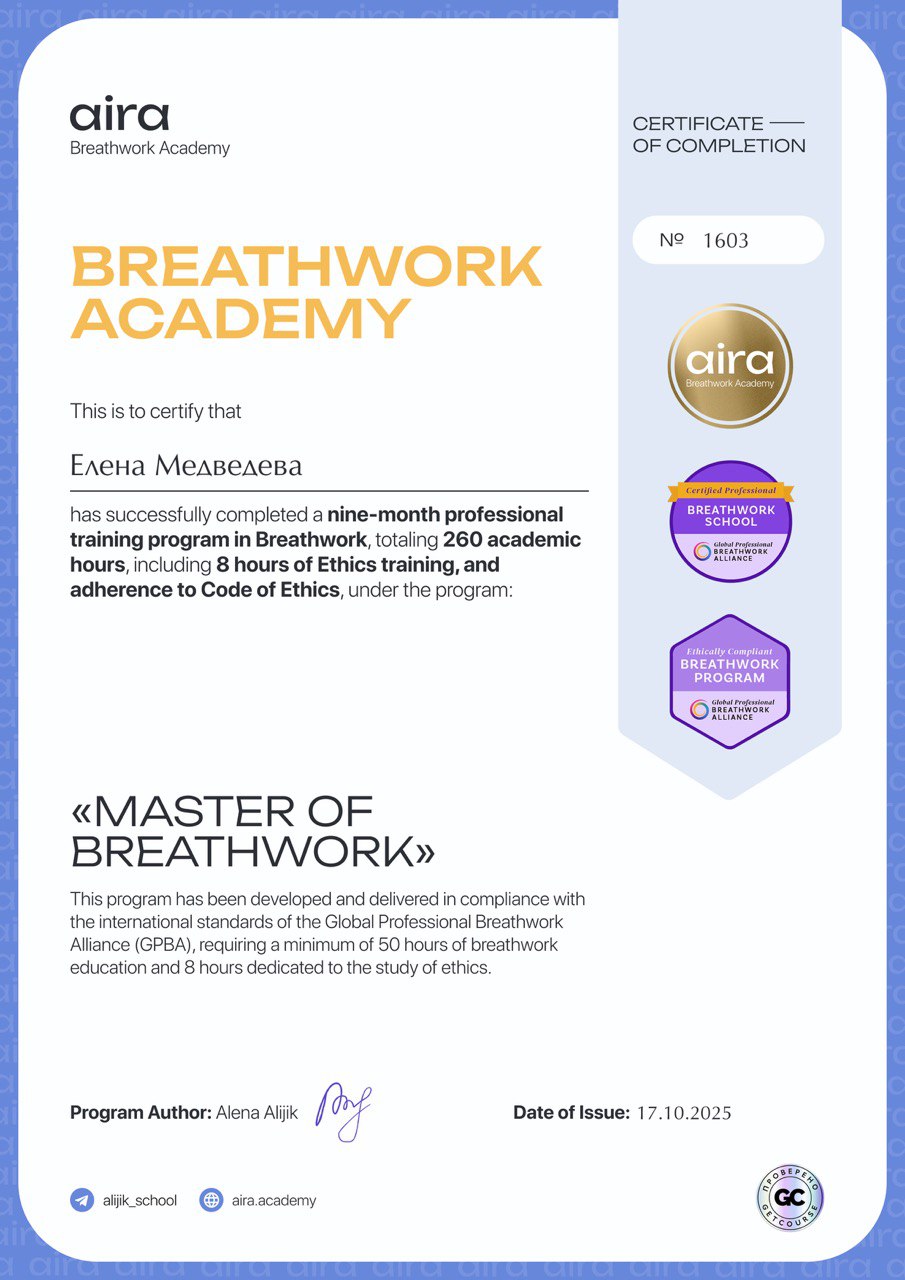 Моя миссия — помогать людям через работу с телом, дыханием и энергией освобождаться от внутренних блоков, находить гармонию с собой и возвращать радость жизни. Для меня важно не просто снимать напряжение и симптомы, а выводить людей на новый уровень осознанности, где появляется свобода выбора, внутренняя сила и настоящий контакт с собой.
