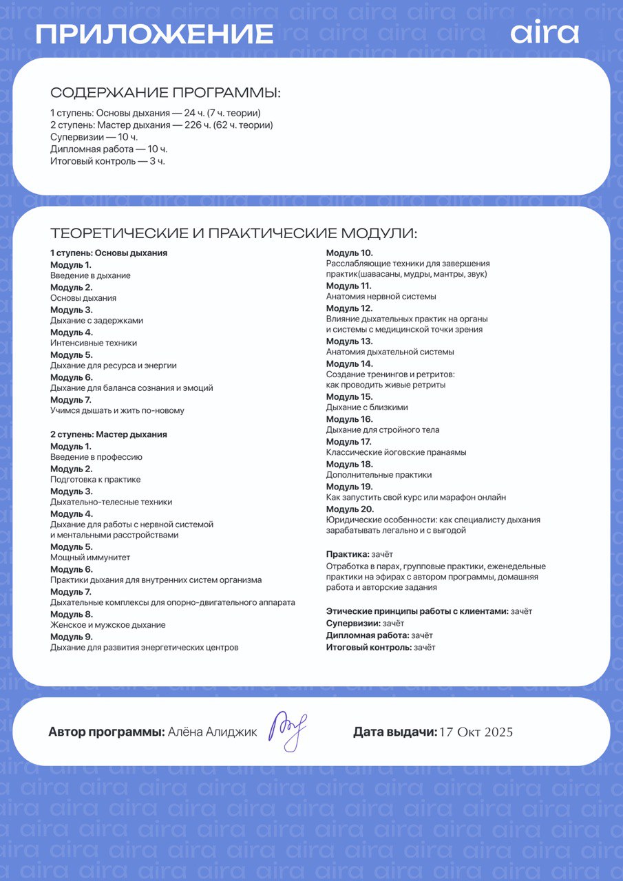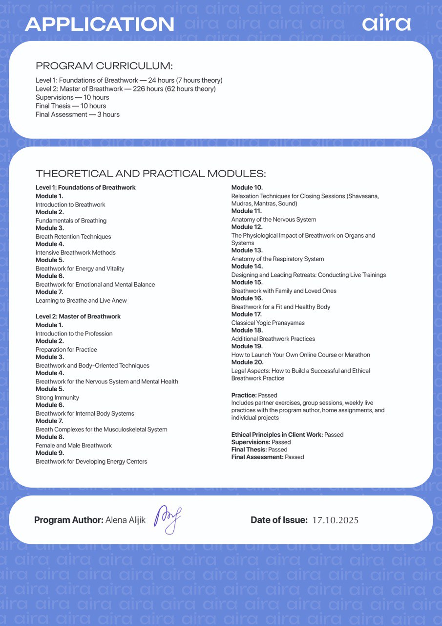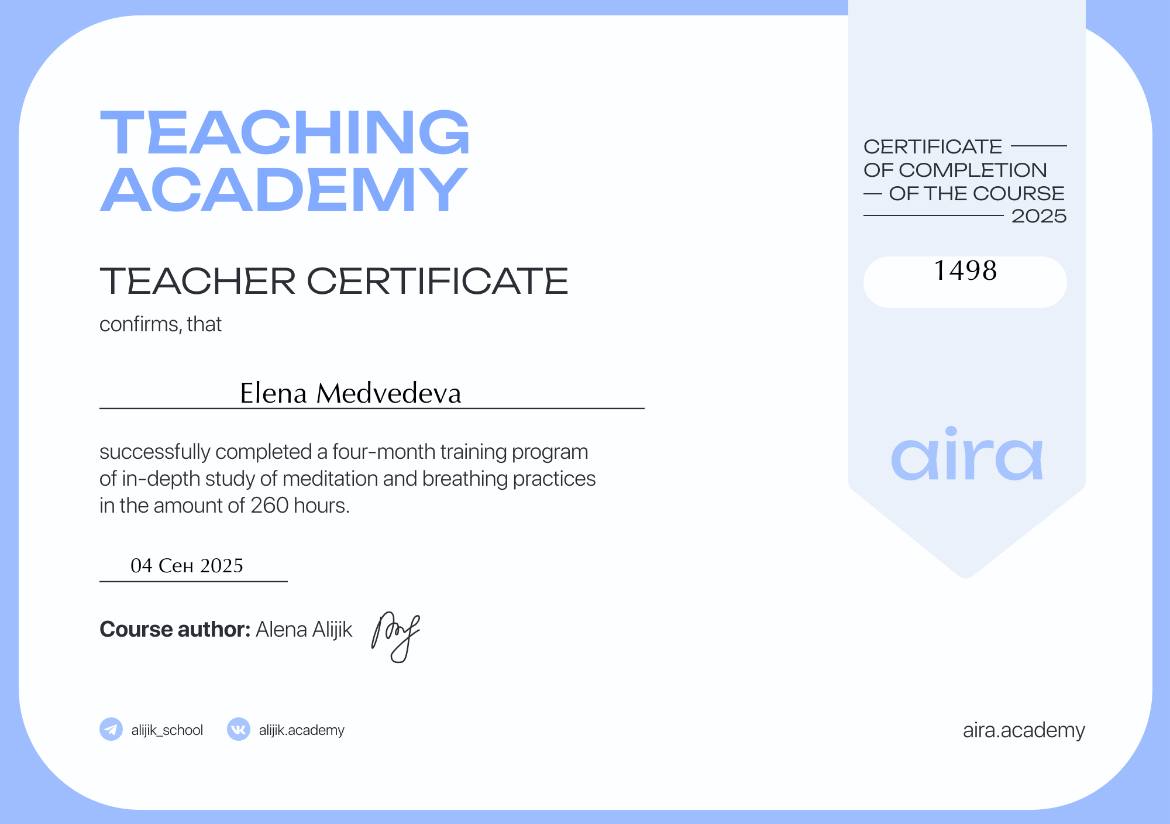 Моя миссия — помогать людям через работу с телом, дыханием и энергией освобождаться от внутренних блоков, находить гармонию с собой и возвращать радость жизни. Для меня важно не просто снимать напряжение и симптомы, а выводить людей на новый уровень осознанности, где появляется свобода выбора, внутренняя сила и настоящий контакт с собой.